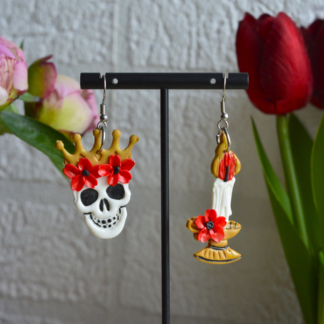 Cercei cu craniu și lumânare cu flori, lucrați manual din lut polimeric. Acești cercei fac parte din colecția de vară și pot fi accesorizați la orice ținută.