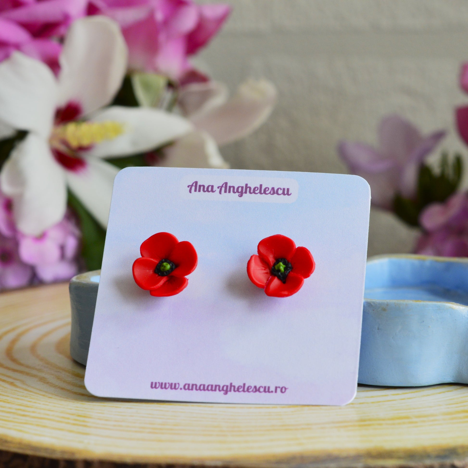 Cercei cu flori de mac, lucrați manual din lut polimeric. Acești cercei fac parte din colecția de vară și pot fi accesorizați la orice ținută.