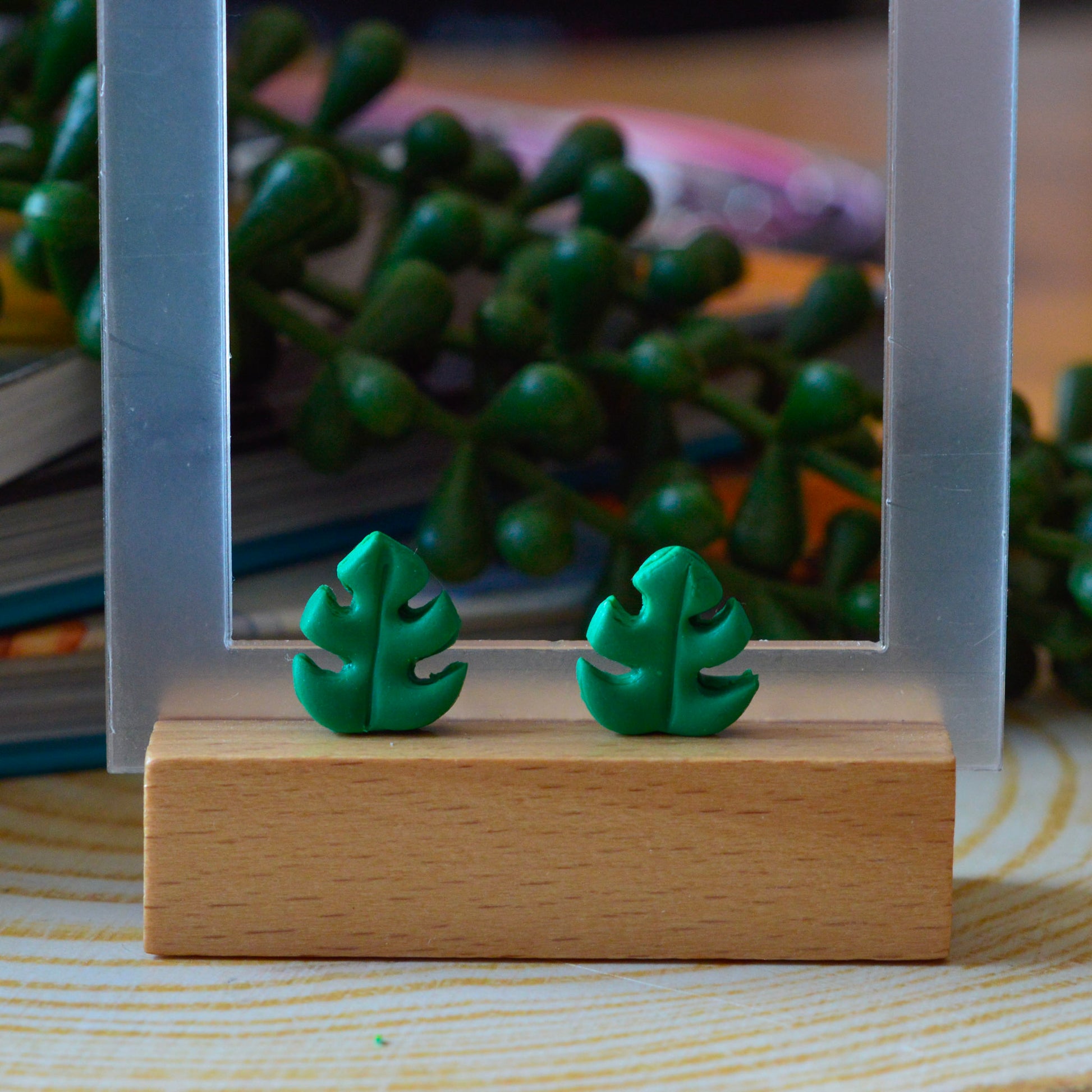 Cercei stud cu monstera , lucrați manual din lut polimeric.