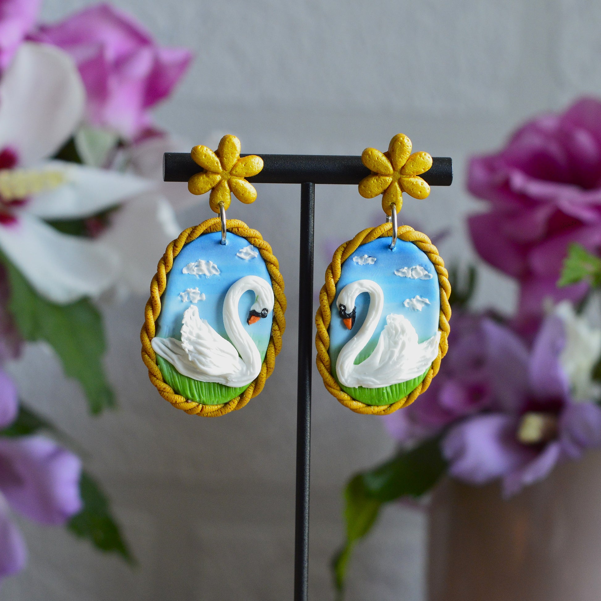 Cercei cu lebădă, lucrați manual din lut polimeric. Acești cercei fac parte din colecția de vară și pot fi accesorizați la orice ținută.
