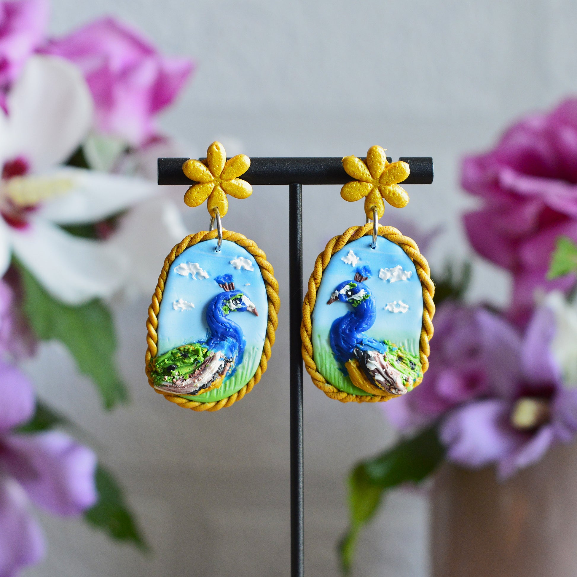 Cercei cu păun , lucrați manual din lut polimeric. Acești cercei fac parte din colecția de vară și pot fi accesorizați la orice ținută.