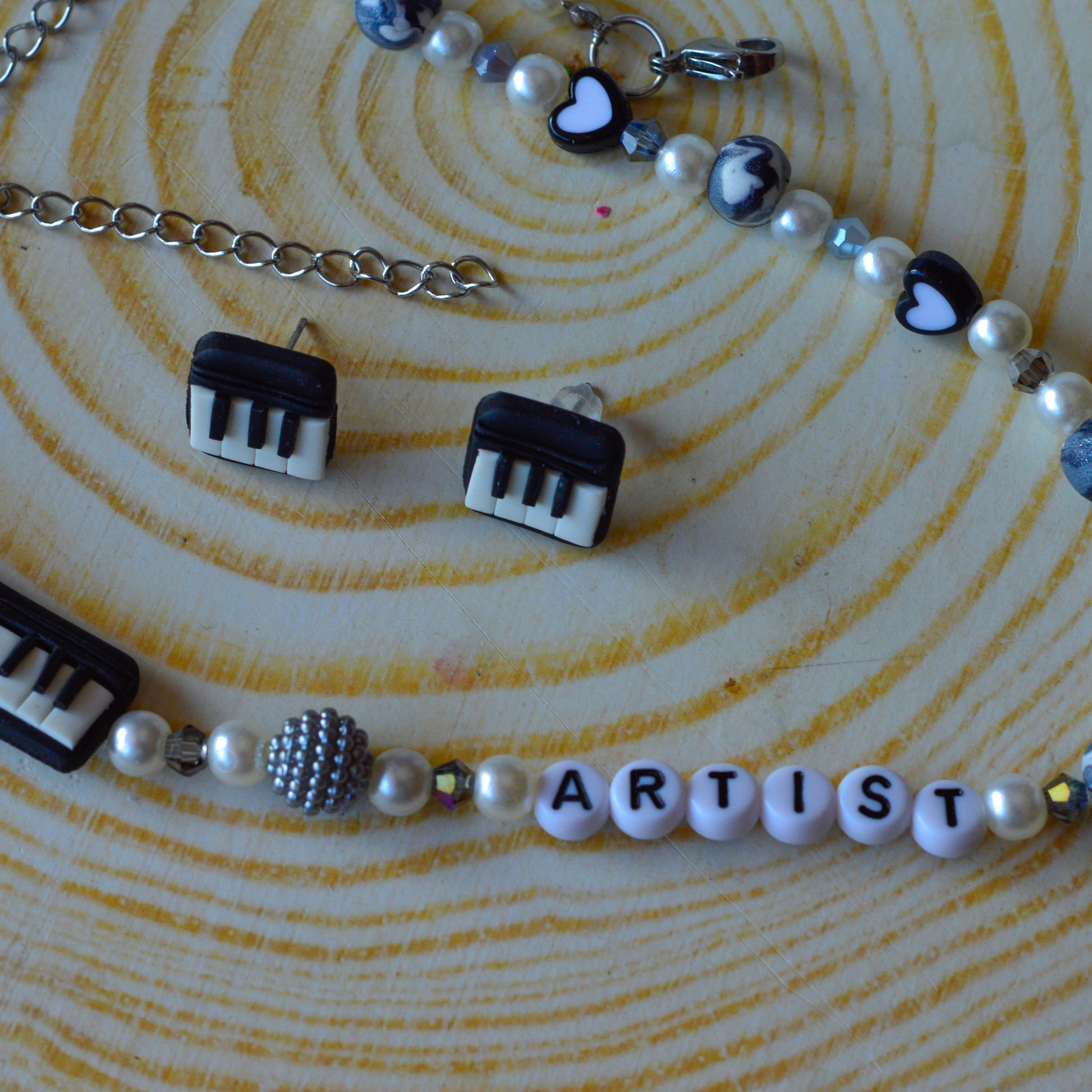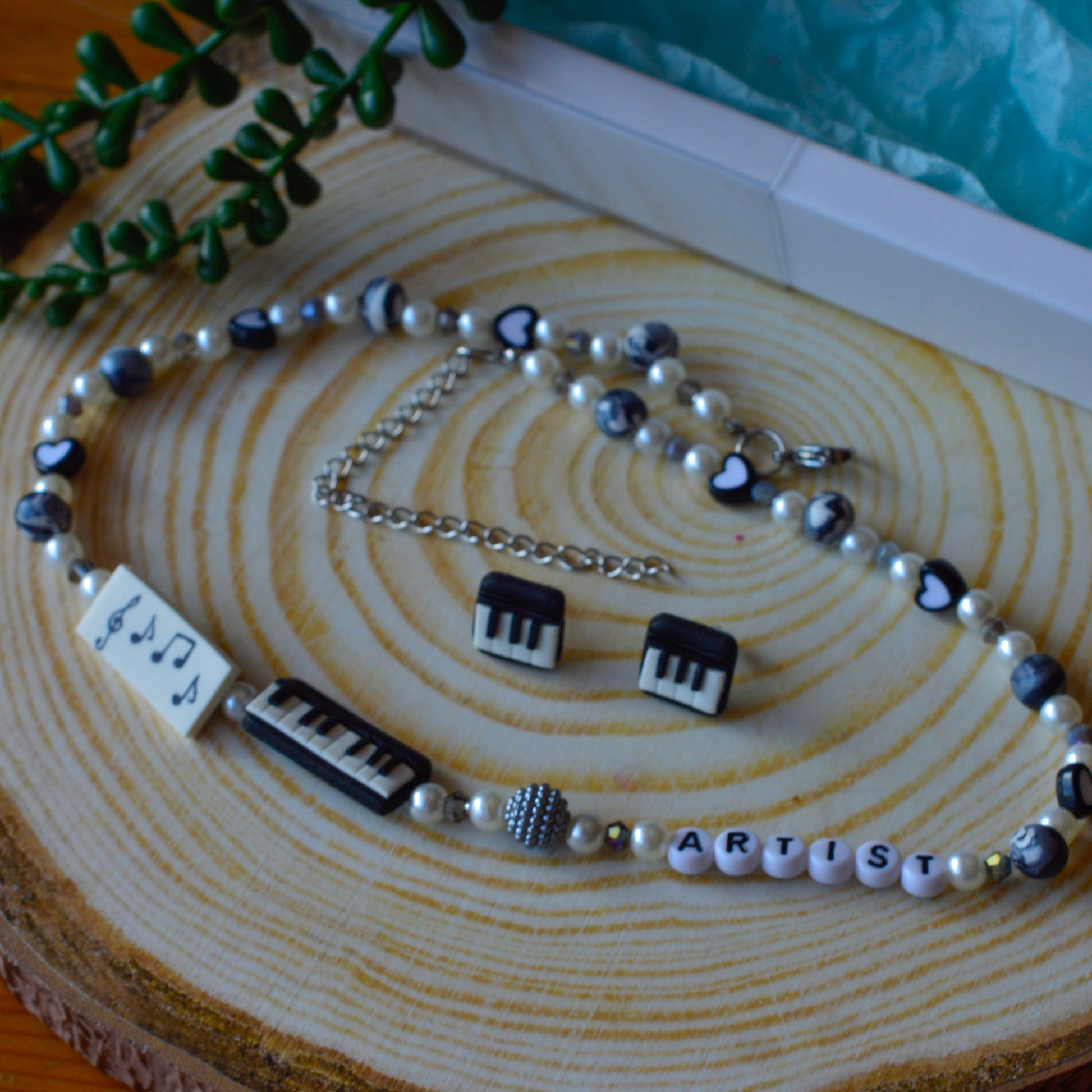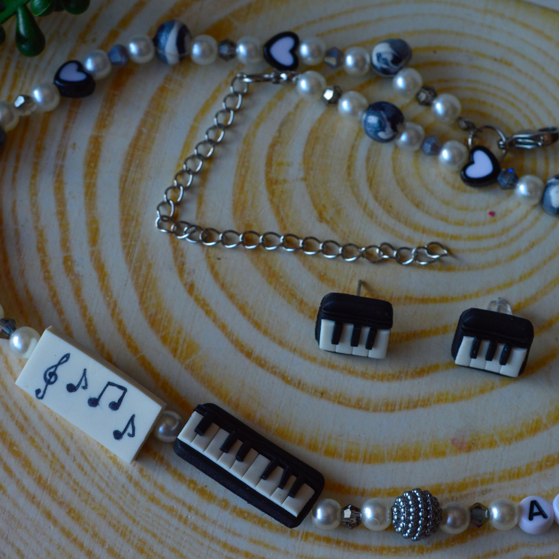Set de bijuterii lucrat manual din lut polimeric. Setul conține un colier din mărgele + elemente din lut polimeric și o pereche de cercei mici. Acesta va ajunge la tine într-o cutiuță albă.
