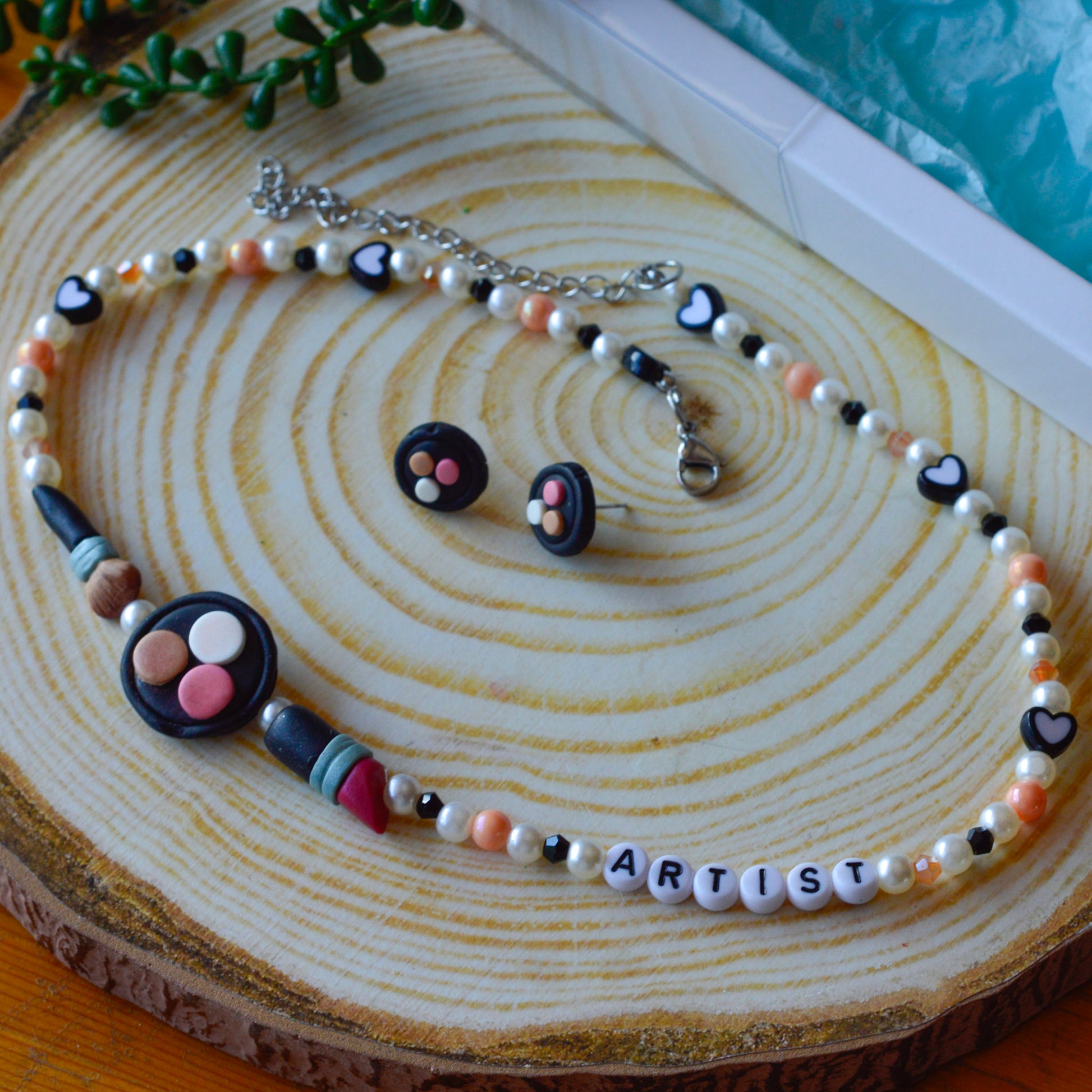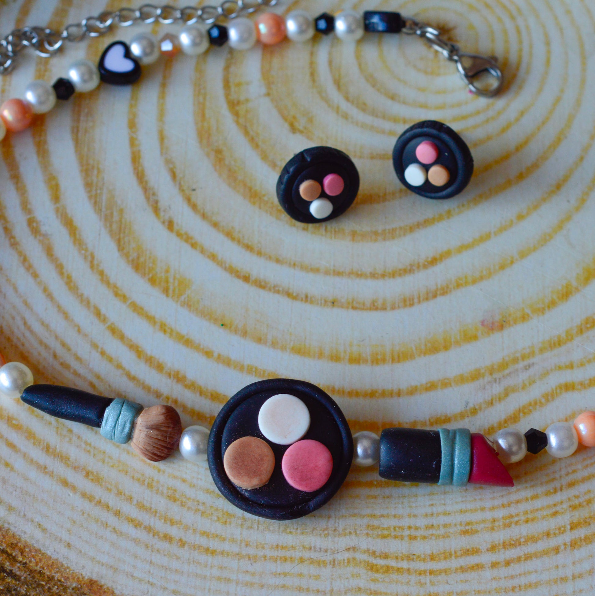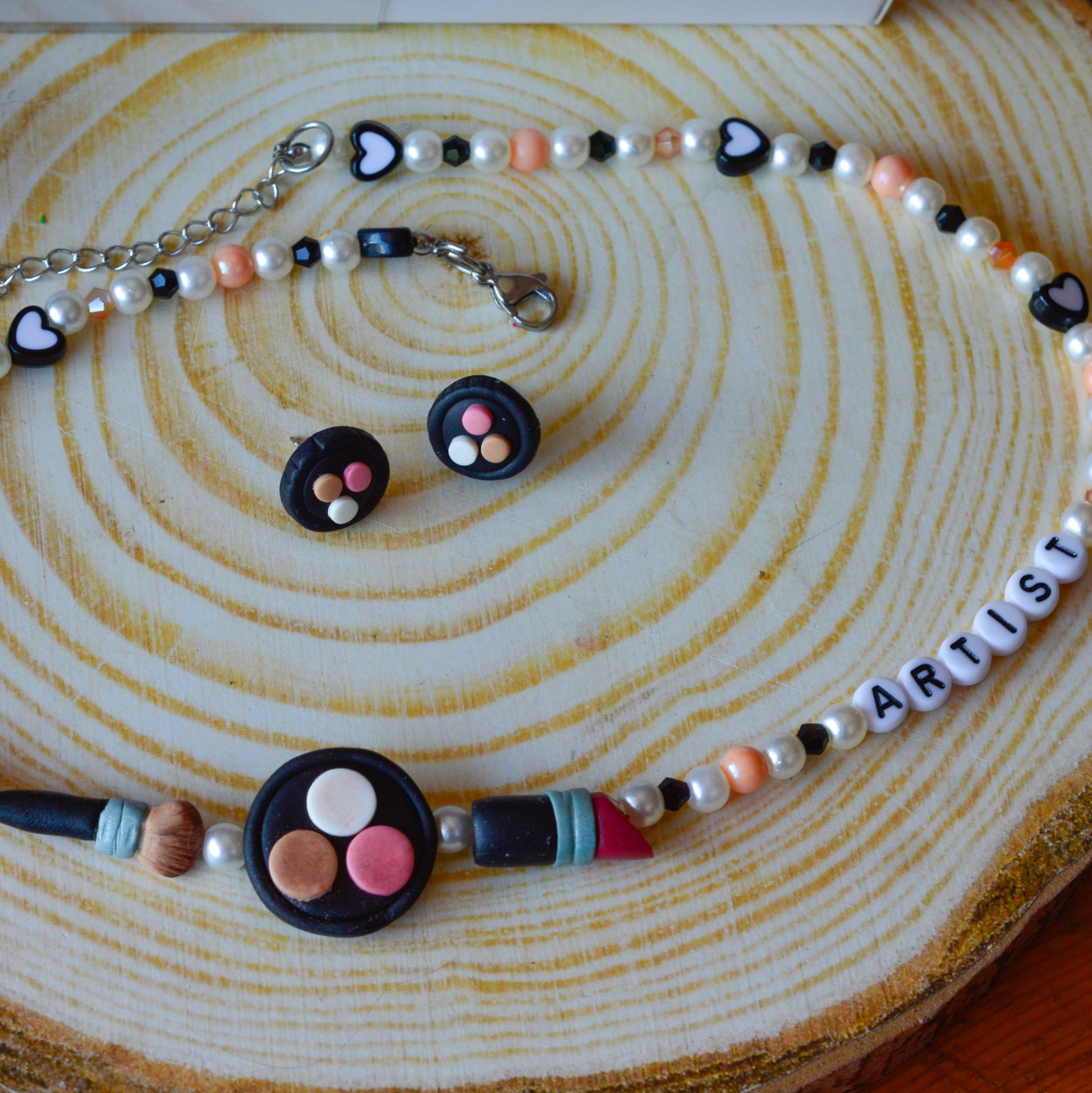 Set de bijuterii lucrat manual din lut polimeric. Setul conține un colier din mărgele + elemente din lut polimeric și o pereche de cercei mici. Acesta va ajunge la tine într-o cutiuță albă.