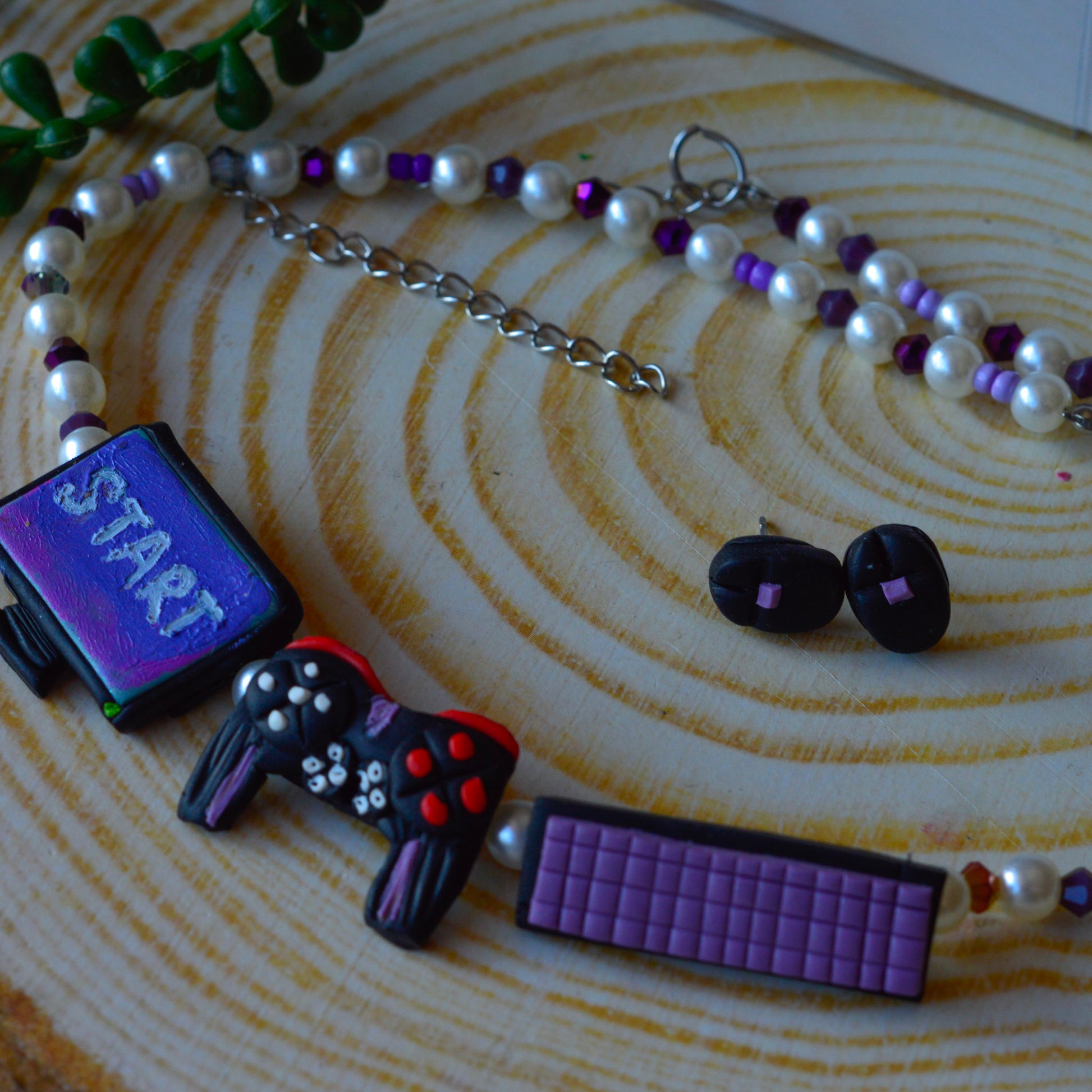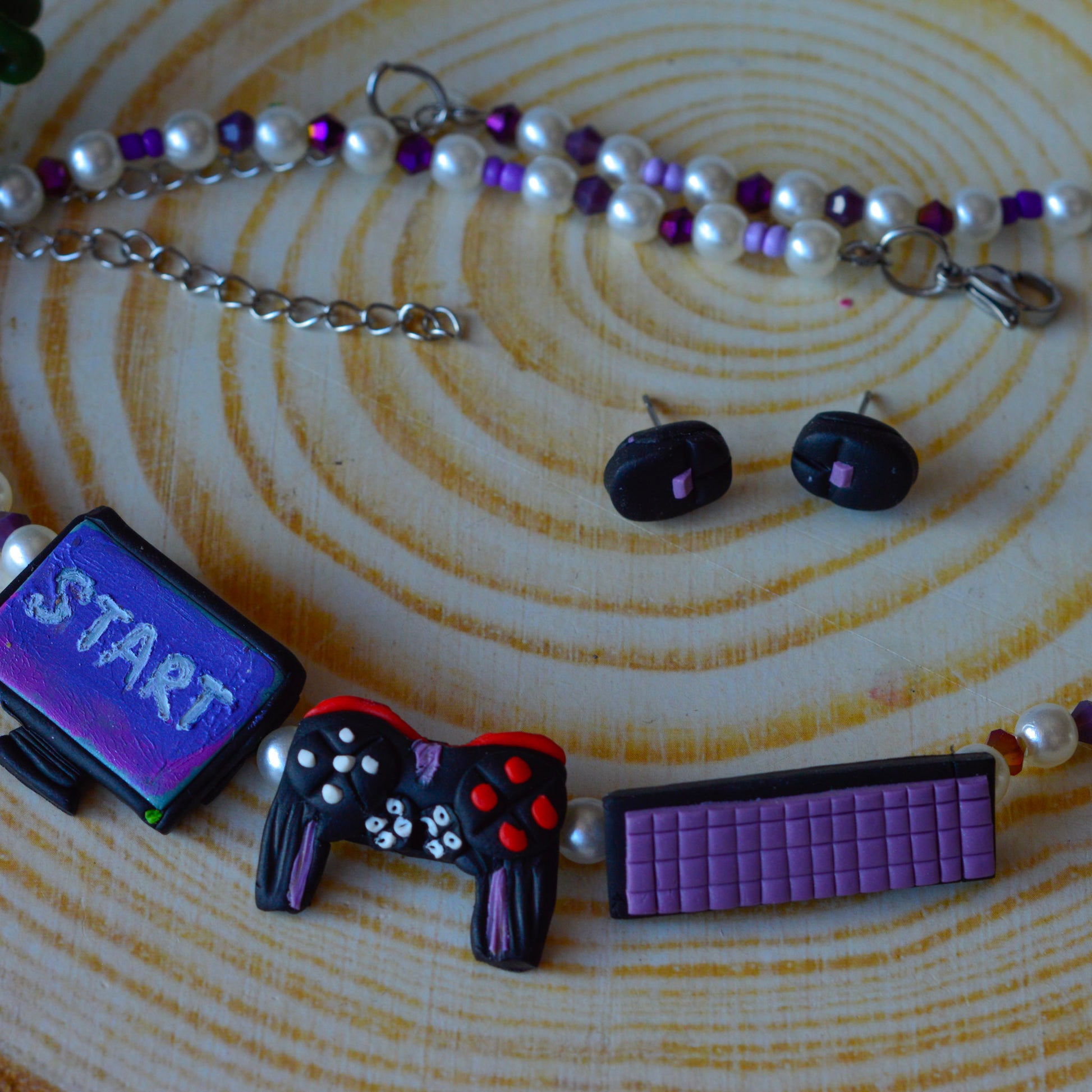Set de bijuterii lucrat manual din lut polimeric. Setul conține un colier din mărgele + elemente din lut polimeric și o pereche de cercei mici. Acesta va ajunge la tine într-o cutiuță albă.